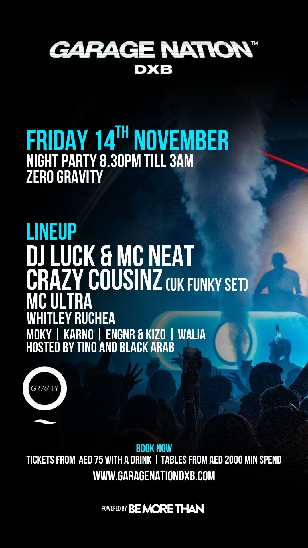 GARAGE NATION DUBAI RETURNS 14th NOVEMBER! Garage Nation Dubai returns and this time they bring two Legends of the UK Garage Scene, non other than DJ Luck and MC Neat! And because we like to throw in a a little something extra we’re also bringing you UK Funky’s heavyweight DJ Crazy Cousinz. Joining these two huge names will be MC Ultra who teams up with DJ Whitley Ruchea, returning local heroes DJs Moky, Karno, Walia and Engnr and Kizo also bring you all your UKG favourites hosted under the stars from 8:30pm - 3am at Zero Gravity on Friday 14th November by the duo of all duo’s Tino and Black Arab. Tickets are on sale now from 100 AED and Tables from 2000 AED. All tickets include 1 Free Drink if you arrive before 10pm.